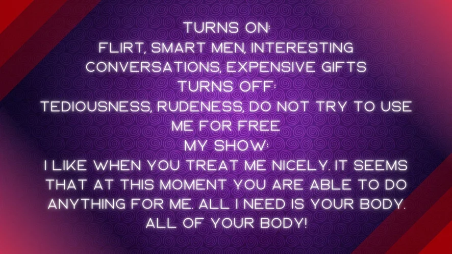 Erotski ples, Toples, Pokazivanje, Ispod suknje, Pseća poza, Spanking, Pušenje, Prljavi razgovor, Fisting, Striptiz, Dildo ili vibrator, Masturbacija, Prstenjanje, Tittyfuck, Orgazam, Kaubojka, Seks Igračke, Show s uljem, Analne igračke