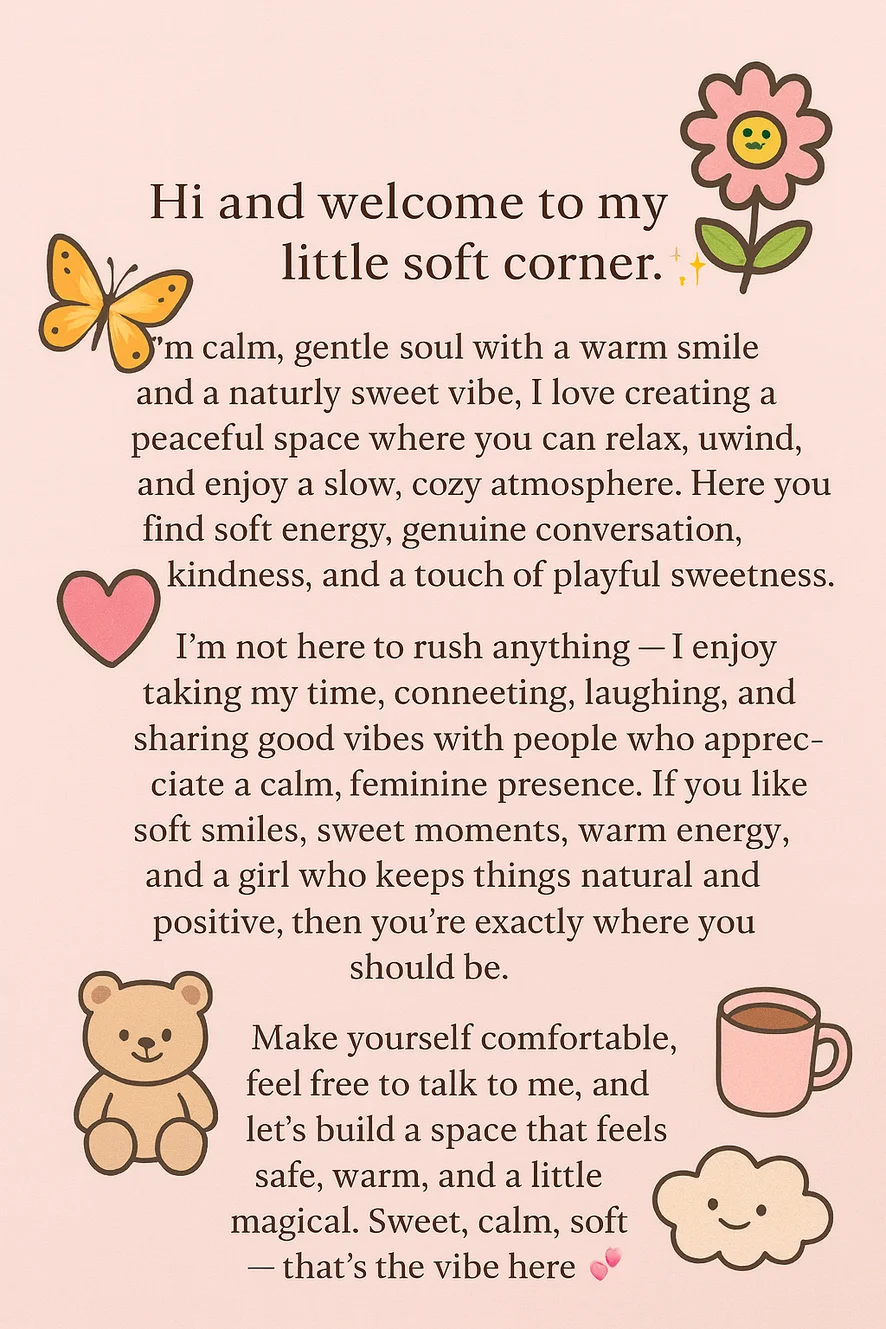 “I’m a soft, calm soul who loves good conversation and cozy vibes. Stay a while, relax, and enjoy a peaceful, sweet atmosphere with me 🤍.”